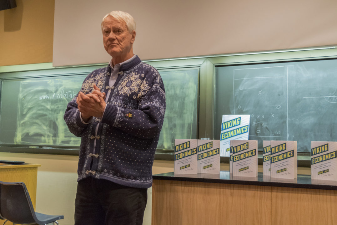 Author George Lakey spoke about fiscal comparisons between Norway and the United States on Thursday, March 23 in Neville Hall.