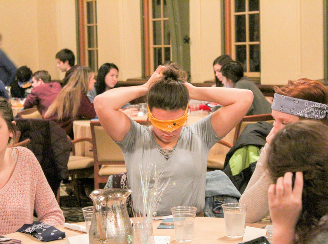 Blindfolded students searched for grilled chicken, penne alla vodka and gemelli pasta in the Asa Packer dining room Nov. 16. This activity was part of Dining in the Dark, an event aimed at increasing awareness of the daily challenges faced by people with vision impairments.