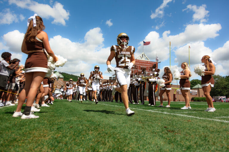 The Lehigh Football team runs onto the field for its home opener against Richmond on Aug. 30 at Goodman Stadium. The Mountain Hawks started their season off with a 21-14 win and are now 11-0. (Griffin Sawyer/B&W Staff)
