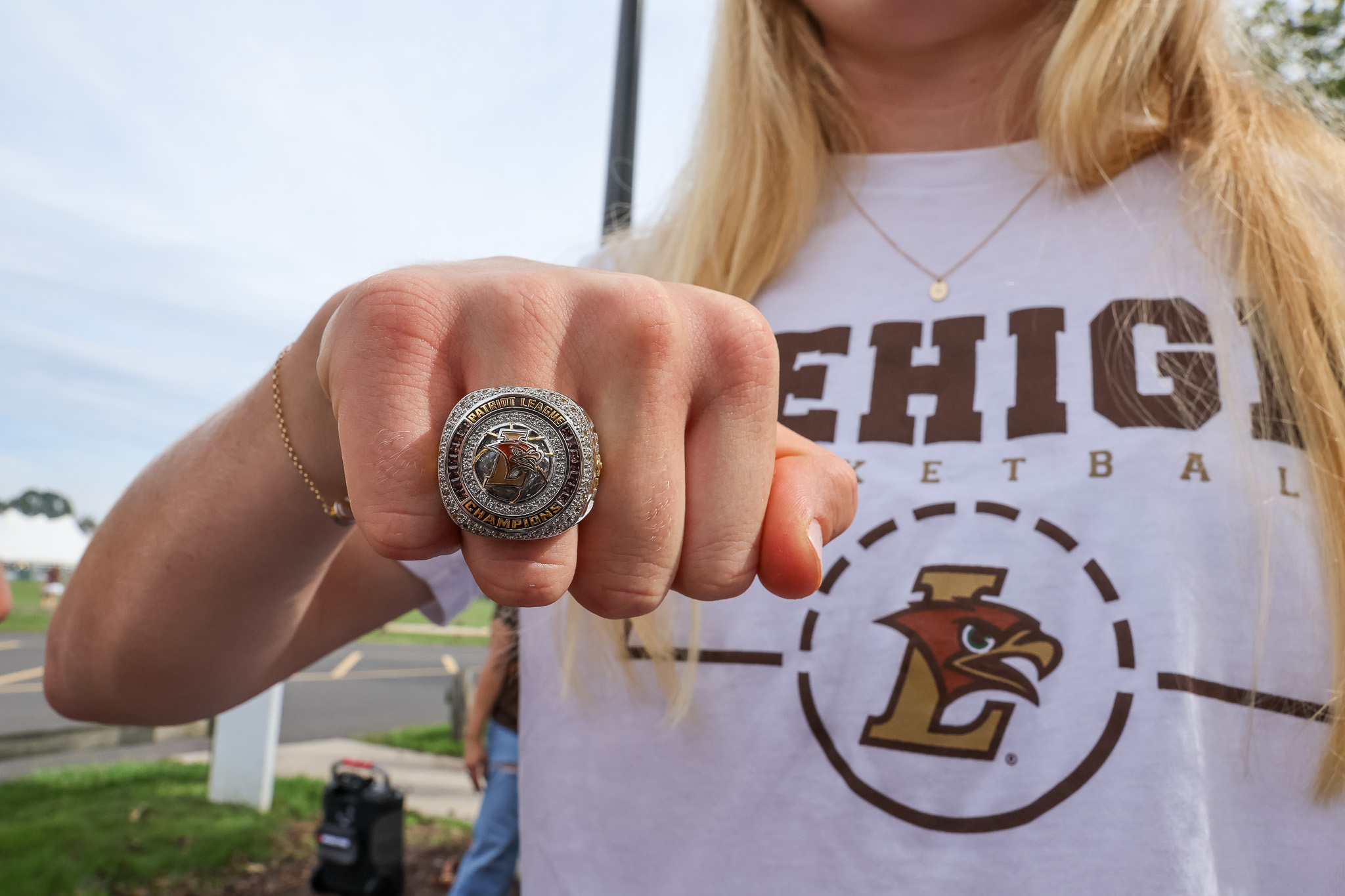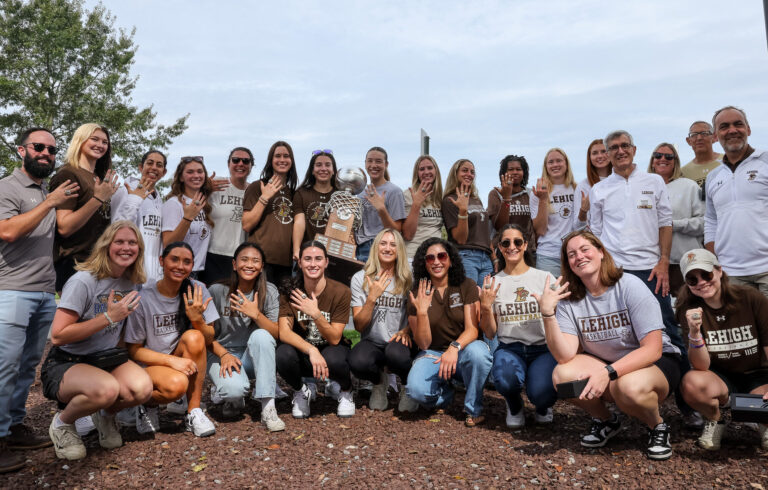 Players are pictured with their hands together to show off their 2025 Patriot League Championship rings. Lehigh competed in the first round of the 2025 NCAA March Madness against Duke on March 21. (Olivia Link/B&W Staff)Maddie Albrecht, ’25, is pictured with her Patriot League Championship ring. Albrecht was named Patriot League Scholar of the year last year. (Olivia Link/B&W Staff)Former guard/forward Remi Sisselman pose with her parents, ring and the Patriot League Championship trophy. Sisselman contributed 11 points in the championship game against Army. (Olivia Link/B&W Staff)The 2025 coaching staff is pictured with their rings and the Patriot League Championship trophy. Head coach Addie Micir made history in the 2024–25 season, as she lead the team to one of its most successful campaigns in program history with 27 wins. (Olivia Link/B&W Staff)Sophomores and guards Keshia Vitalicio, Sibelle Zambie, and Belle Bramer pose with their rings while holding the Patriot League Championship trophy. (Olivia Link/B&W Staff)Players surround the Patriot League Championship trophy with their new rings. The Mountain Hawks defeated Army West Point to advance to NCAA March Madness. (Olivia Link/B&W Staff)The 2025 seniors are pictured with the Patriot League Championship trophy and their new rings. Four of the six players pictured tallied triple digits for points in their last season. (Olivia Link/B&W Staff)The 2024-25 team is pictured with their hands in for a team cheer with their new championship rings. The Mountain Hawks were 15-3 in the Patriot League conference last season. (Olivia Link/B&W Staff)