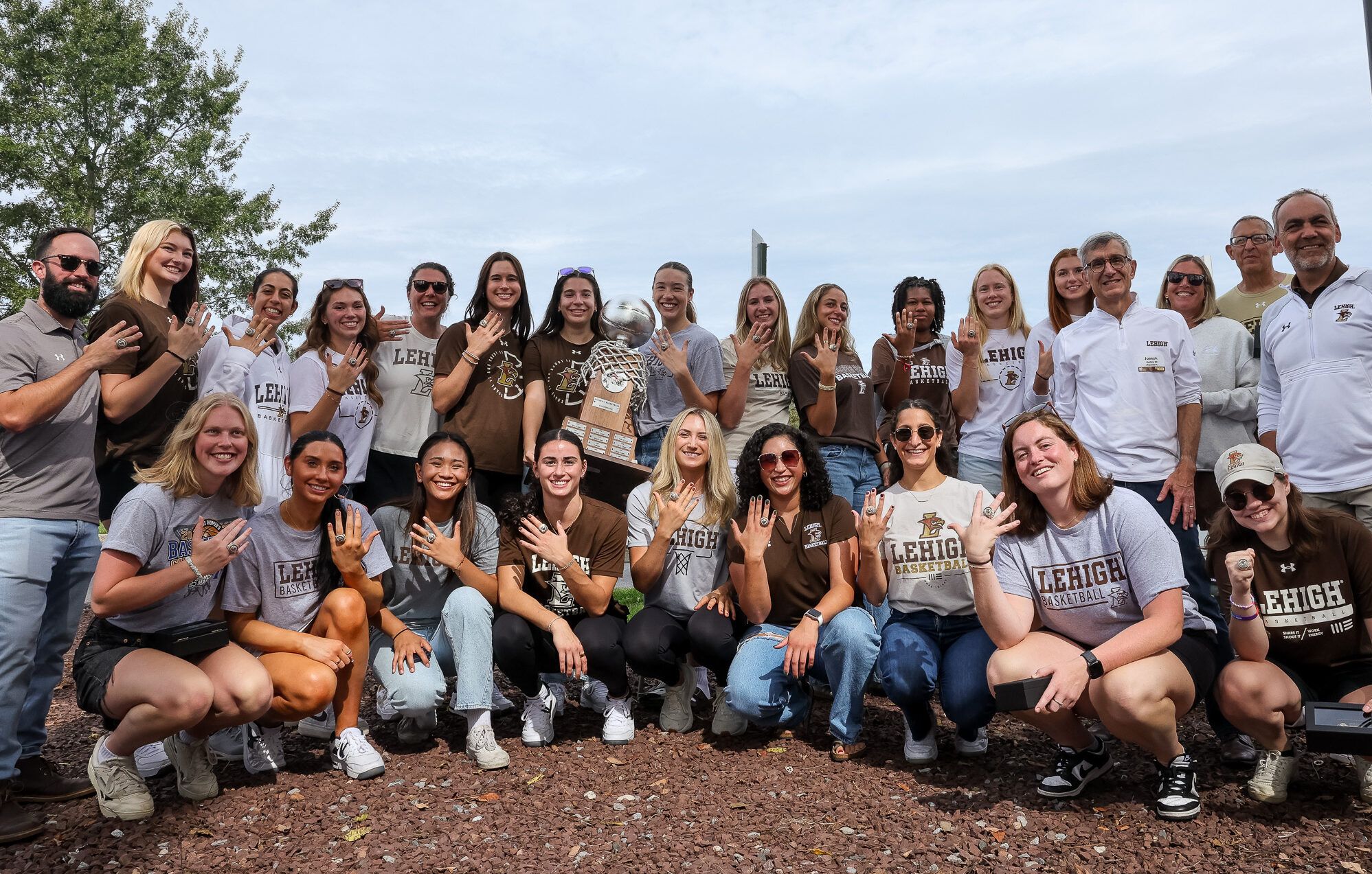 The 2024-25 women's basketball team and staff are pictured with their 2025 Patriot League Championship rings, which were unveiled Saturday before the Lehigh football game against the University of Pennsylvania. The Mountain Hawks claimed a 44-30 victory against the Quakers during the family weekend football. (Olivia Link/B&W Staff)