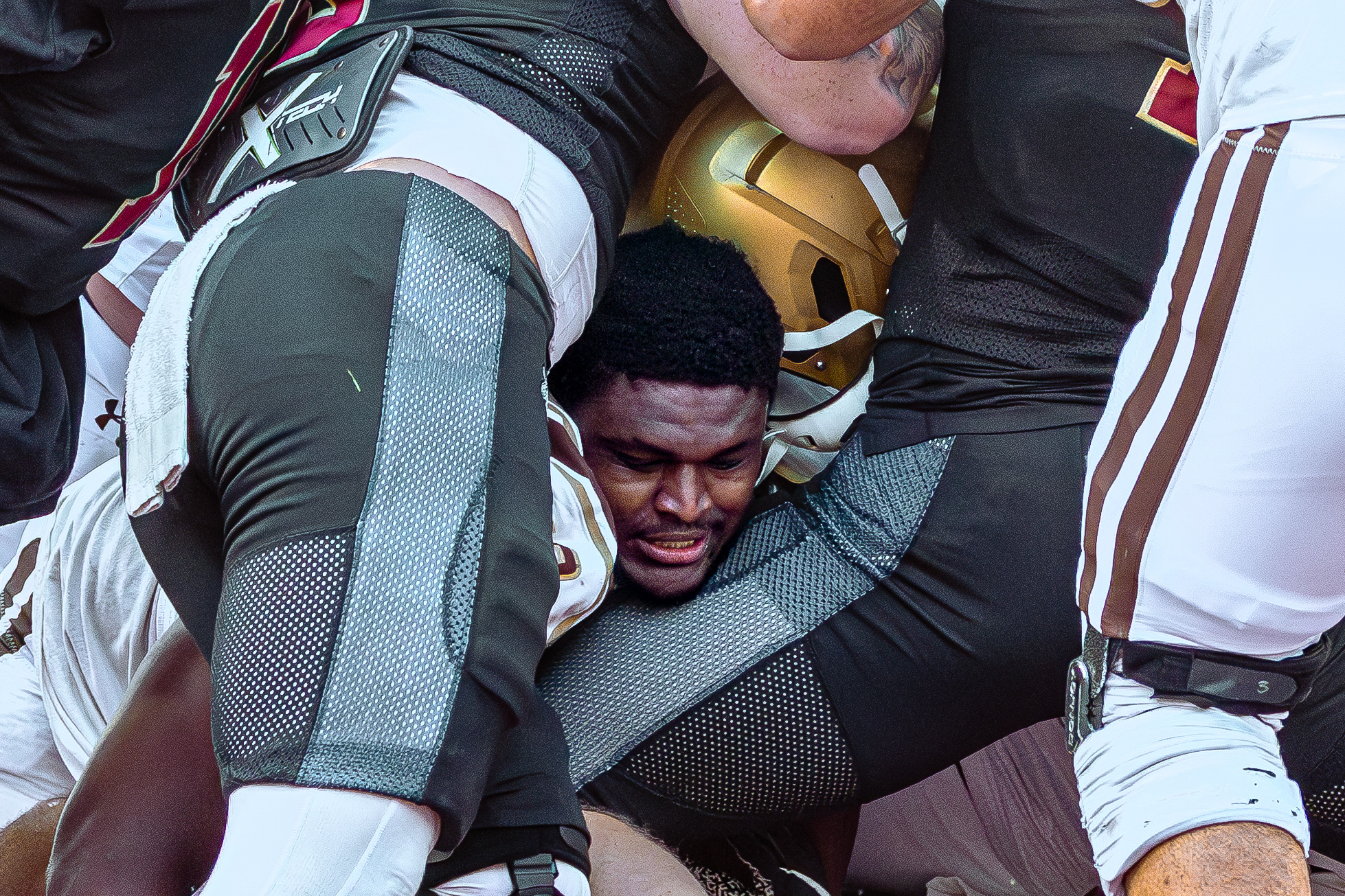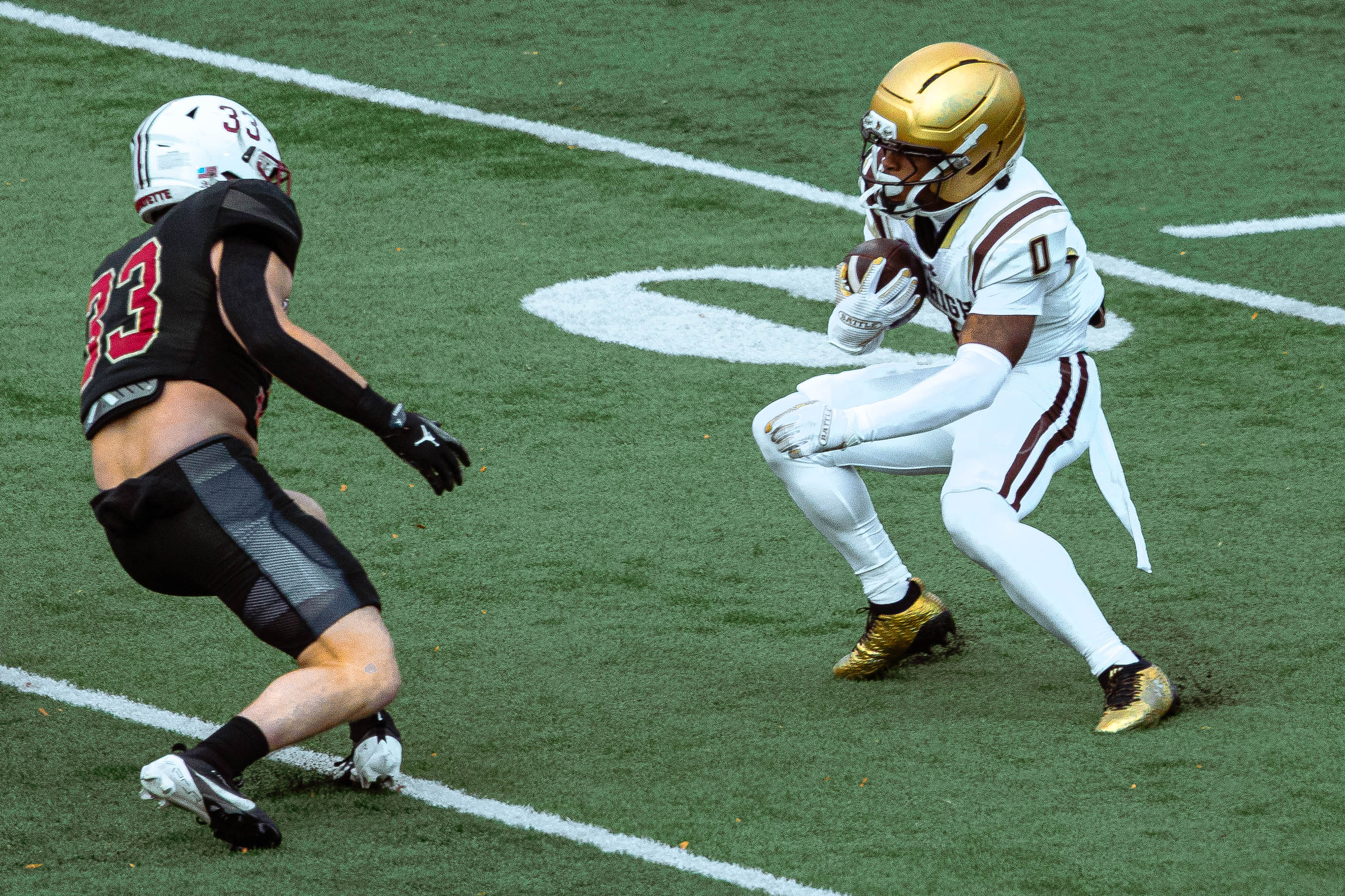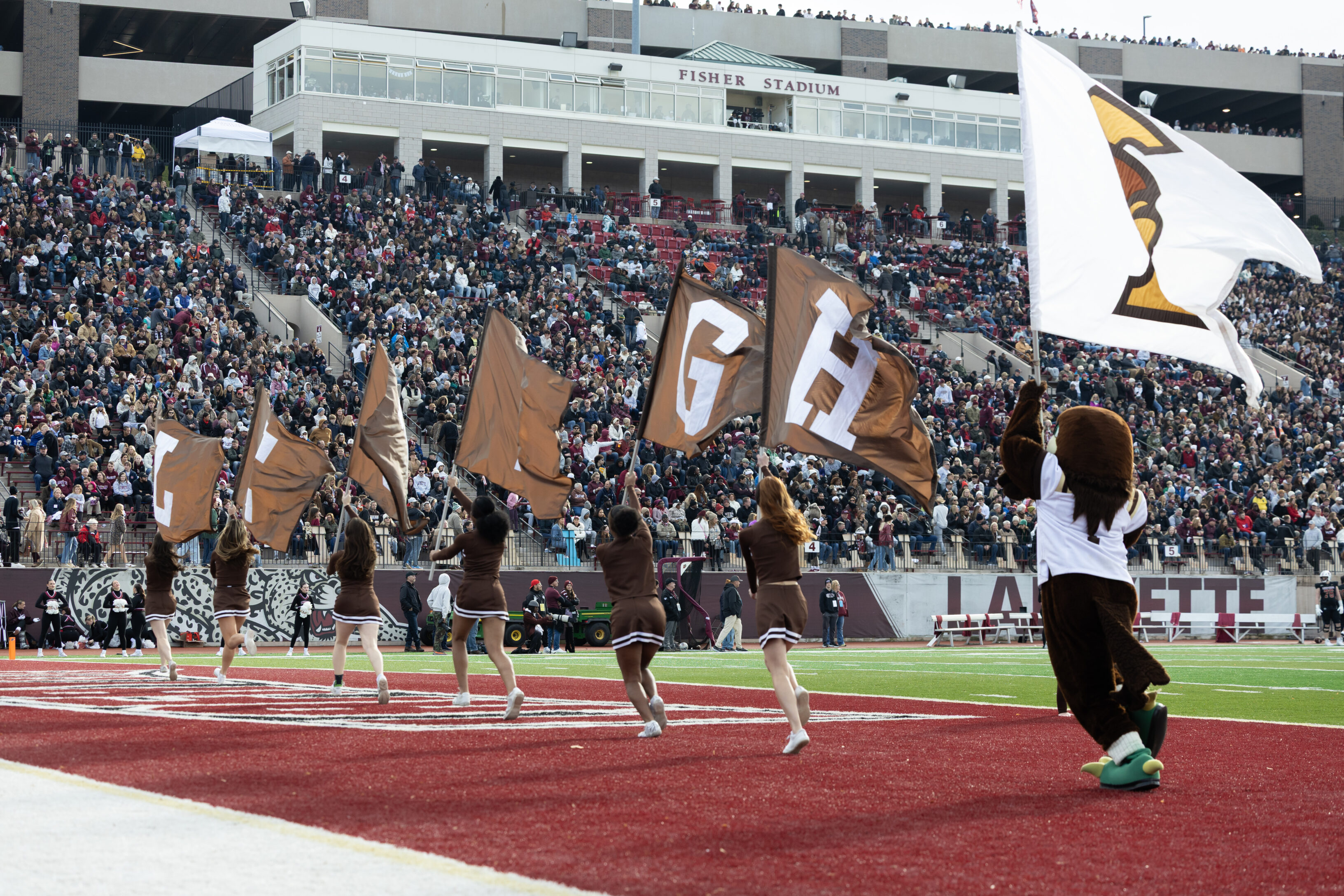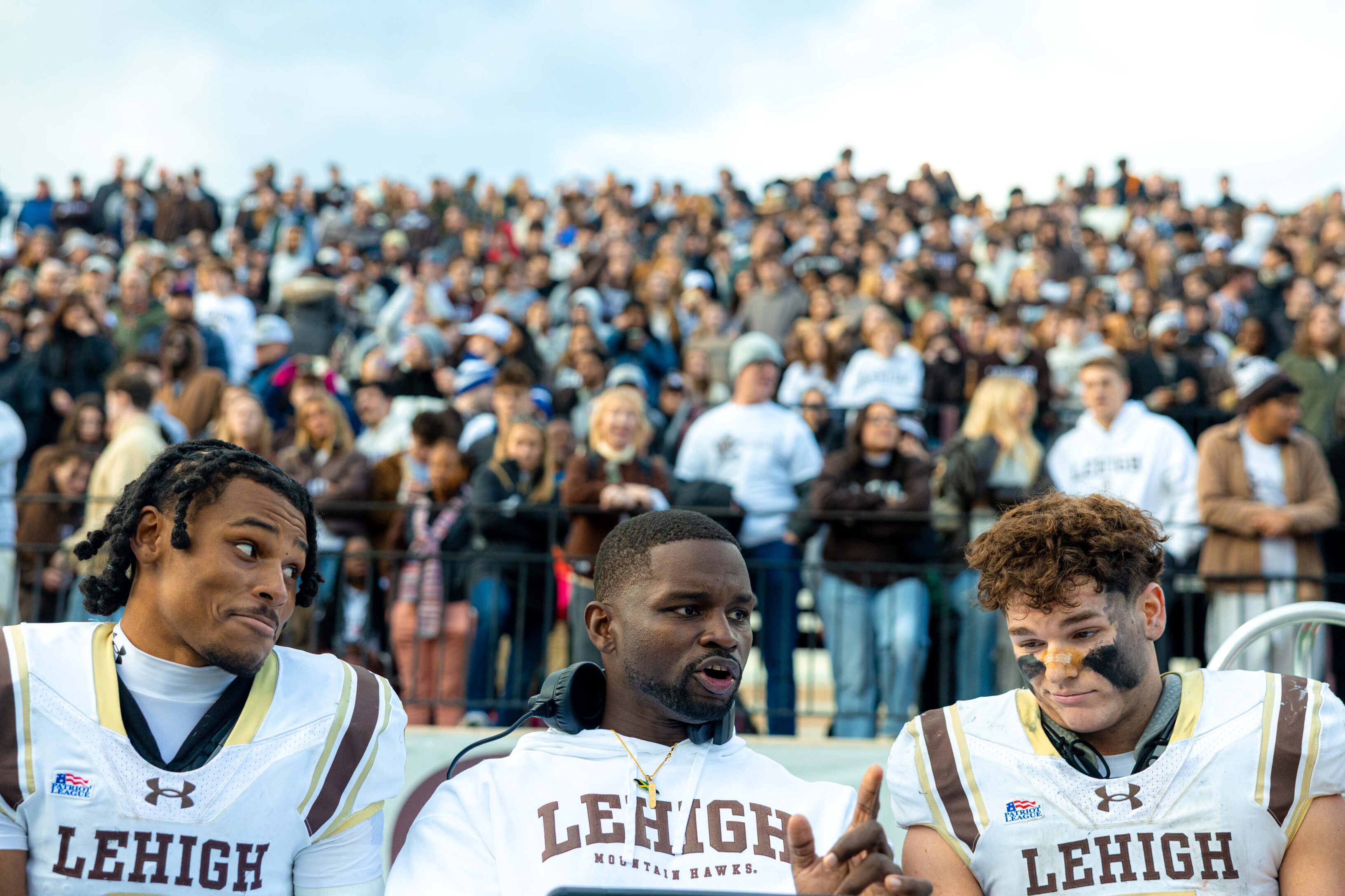 Junior running back Luke Yoder carries the ball during Lehigh’s 42-32 victory over rival Lafayette at Fisher Stadium. Lehigh claimed the Patriot League championship and an automatic berth to the FCS playoffs. (Sara Eleissawy/B&W Staff)A fan celebrates as the Lehigh football team scores a touchdown. The Mountain Hawks scored 28 of their 42 points in the second half. (Griffin Sawyer/B&W Staff)Lehigh cheerleaders parade flags with the letters of the university immediately following a Lehigh touchdown. The win marked Lehigh’s 14th Patriot League title and its first undefeated regular season since 2001. (Sara Eleissawy/B&W Staff)Sophomore running back Jaden Green takes on a Lafayette defender. Green had five carries for 49 yards. (Griffin Sawyer/B&W Staff)Sophomore running back Jaden Green, left, running back coach Chavarr Warren, center, and junior running back Luke Yoder, right, discuss tactics during Lehigh’s 42-32 win over Lafayette. Lehigh rushed for 320 yards as a team and out-gained Lafayette 479-424. (Griffin Sawyer/B&W Staff)Sophomore quarterback Hayden Johnson looks to throw a pass. Johnson completed 11-of-16 passes for 159 yards with one touchdown and one interception and also rushed for 64 yards and a touchdown. (Sara Eleissawy/B&W Staff)Lehigh fans cheer on the team during the sold-out rivalry game at Fisher Stadium. 13,367 fans were in attendance. (Sara Eleissawy/B&W Staff)A Lehigh offensive lineman gets wedged between two Lafayette players without a helmet. Lehigh’s offensive line helped the team average 9.7 yards per carry. (Griffin Sawyer/B&W Staff)A young fan cheers on the Lehigh football team during Lehigh’s 42-32 victory over Lafayette. The Lehigh–Lafayette football matchup is the most played rivalry in college football, with 161 games played as of Saturday. (Griffin Sawyer/B&W Staff)Lehigh fans rush the field to celebrate as the clock hits zero in the team’s 42-32 victory over Lafayette. The Mountain Hawks finished the regular season undefeated at 12-0 (8-0 in Patriot League play). (Sara Eleissawy/B&W Staff)