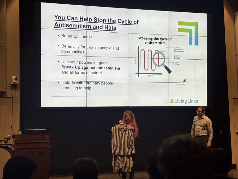 On Tuesday, the Interfraternity Council and Lehigh’s chapter of Alpha Epsilon Pi invited two members of Living Links to speak about the Holocaust and antisemitism. The event took place in Packard Hall and was hosted by Dave Wachs, ‘02, and Amy Goodman.